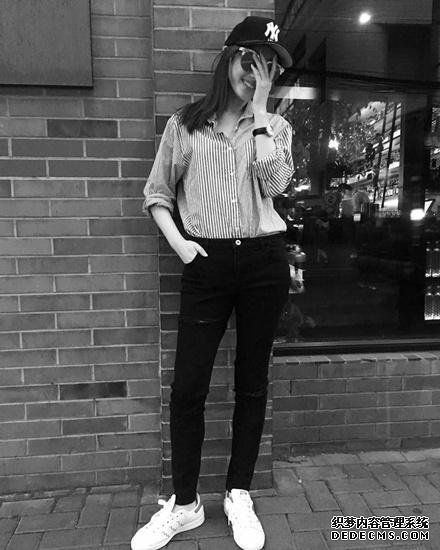 让我们来看看蒋蒙予的其他样式不管脚踝暴露?,当你移动一个正常的裤子一侧一体,可以改善外观?非常舒适,与配合的白色T恤方格图案整体外观。
